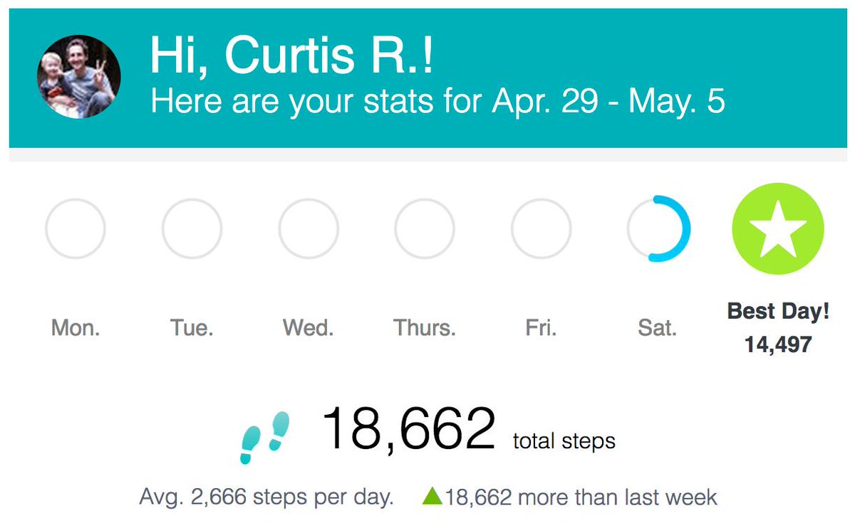 I got a Fitbit! I like it a lot. After recording data for 2.5 days, it sent me my first 7-day summary. I am far too amused by the assumption that I must have walked no steps on days prior to device activation. Coin-flip fallacy variant: when data values are unknown, assume zero!