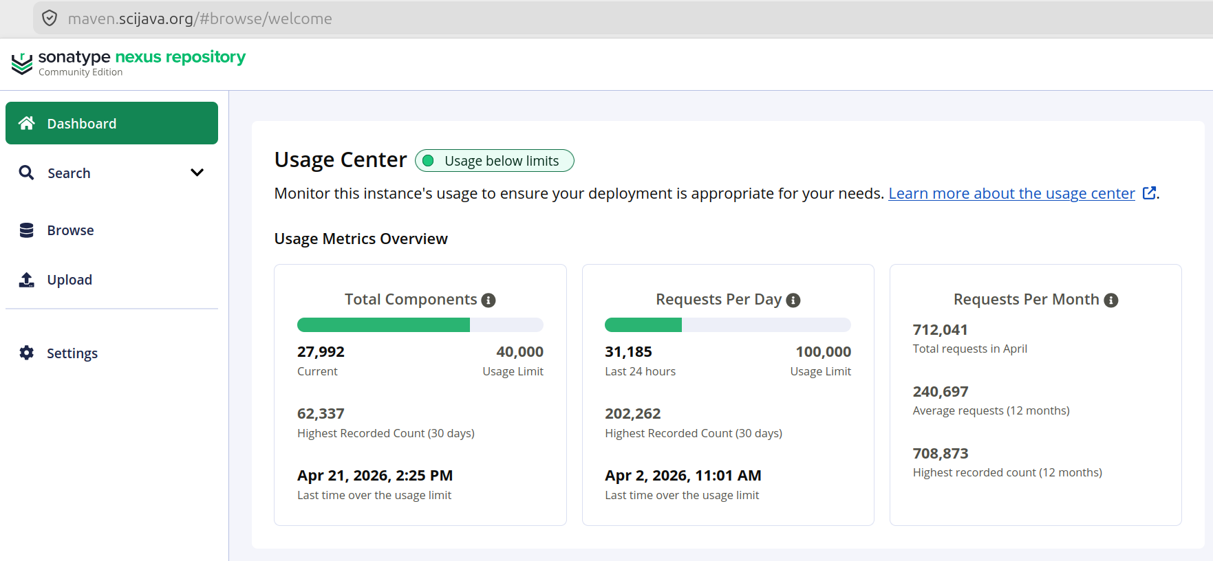 With the release of Nexus v3.87.0 late last year, the already problematic component limit was cut by another order of magnitude, from 100,000 to 40,000, and the daily request limit also reduced from 200,000 to 100,000. The user community is not pleased.